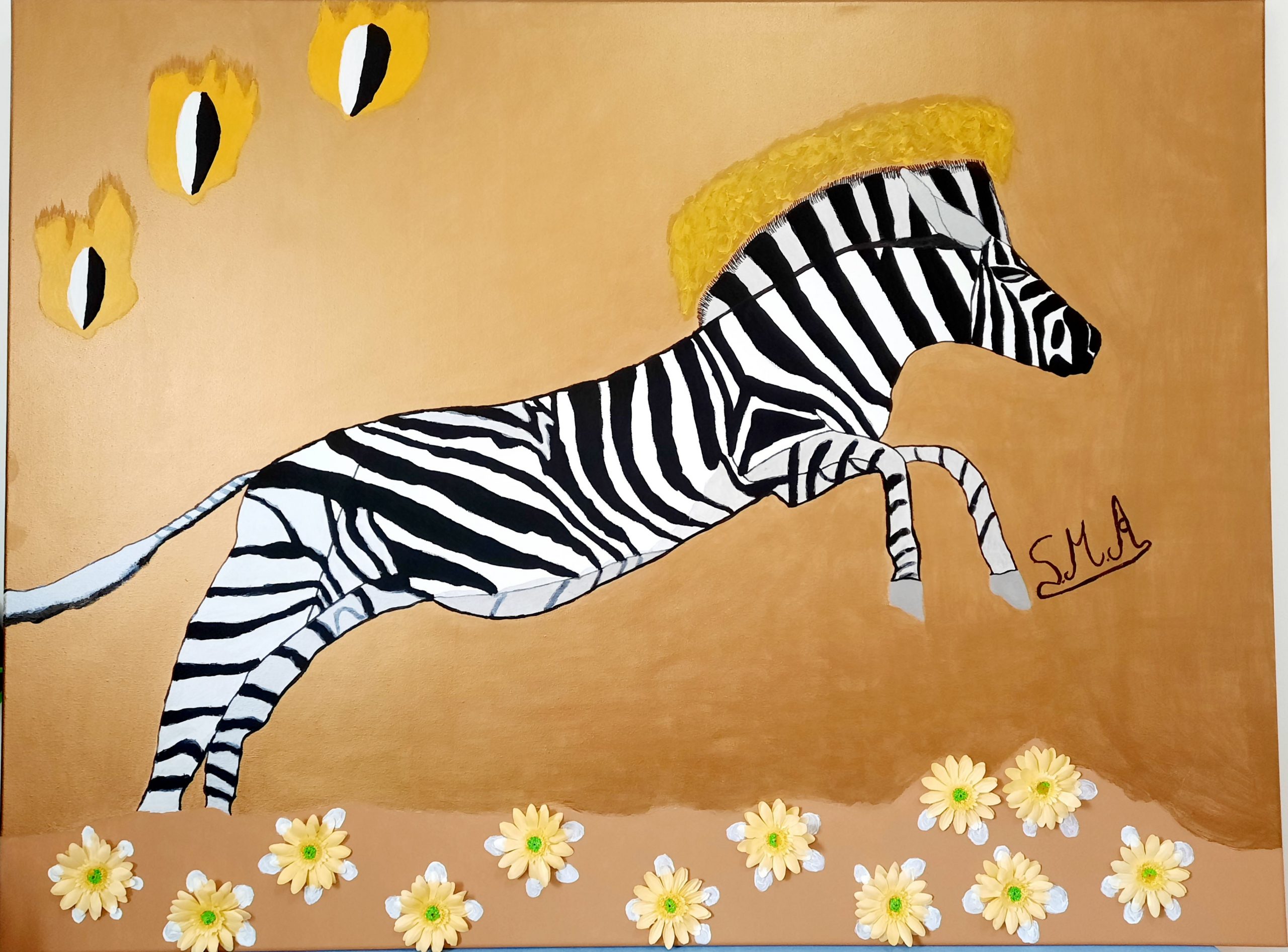 Peinture Acrylique sur toile, moderne avec noir , blanc et jaune sur fond marron dorado.